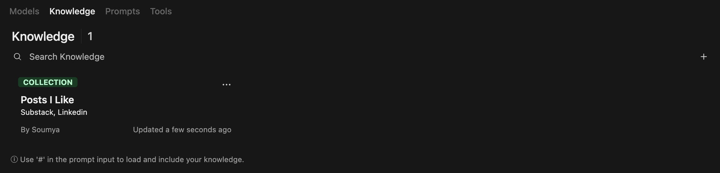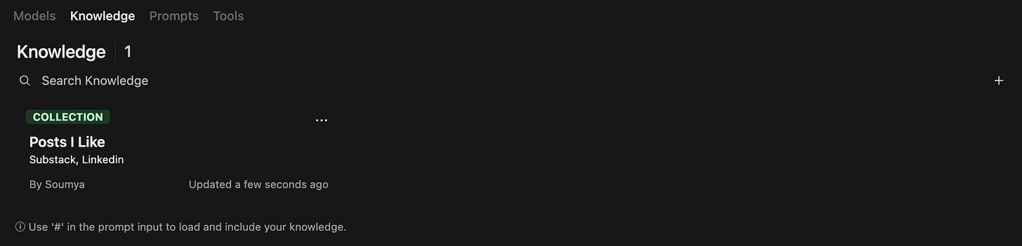 OpenWebUI let’s one add documents and collections to reference for RAG tasks. While this is very straight forward to do if it is hosted locally, having a container image can make it slightly more tricky. To navigate around this I created a synced folder in my NAS that triggers an event to copy whatever is pasted there to the docker container. Alternatively one can also create a knowledge base from the WebUI knowledge section.